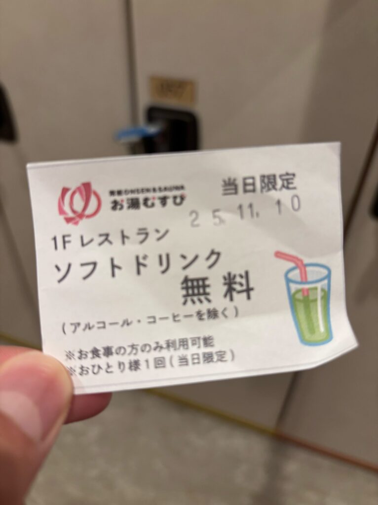 入館時には館内レストランで使用できるクーポン券も配布しており、食事をすればソフトドリンクを1杯無料で飲むことができます。