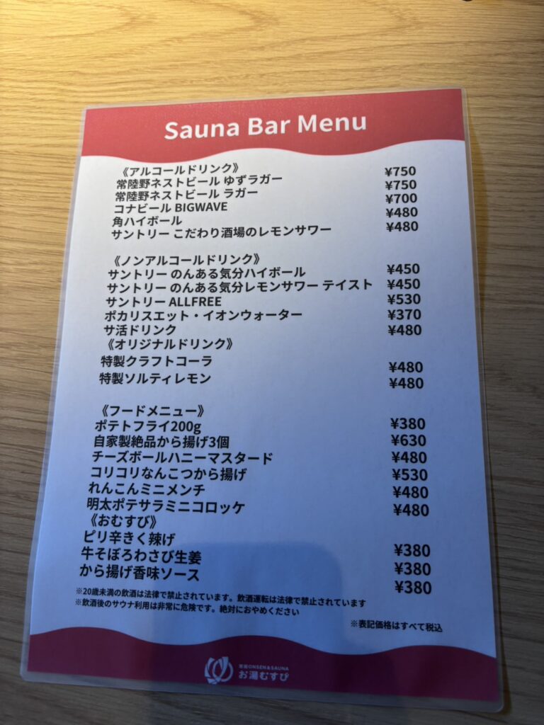 サウナで水分が抜けた後は塩味が欲しくなりますよね。ここのフードメニューはポテトフライから揚げなど絶妙な塩分補給ができそうなメニューが勢ぞろいなのがより一層食欲をそそりますね。