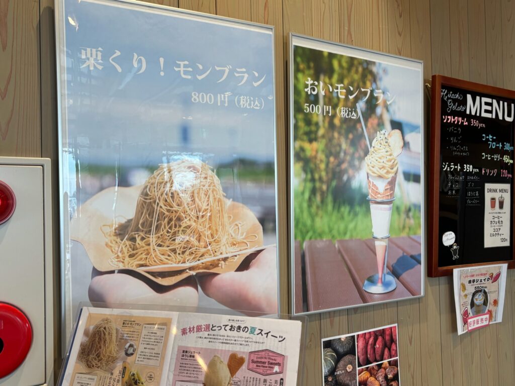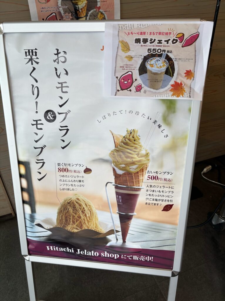 モンブランは「道の駅ひたちおおた」のHitachi Gelatoにて購入することができます。モンブラン以外にも「焼芋シェイク」やジェラート、ソフトクリームなどの甘味も味わうことができます。