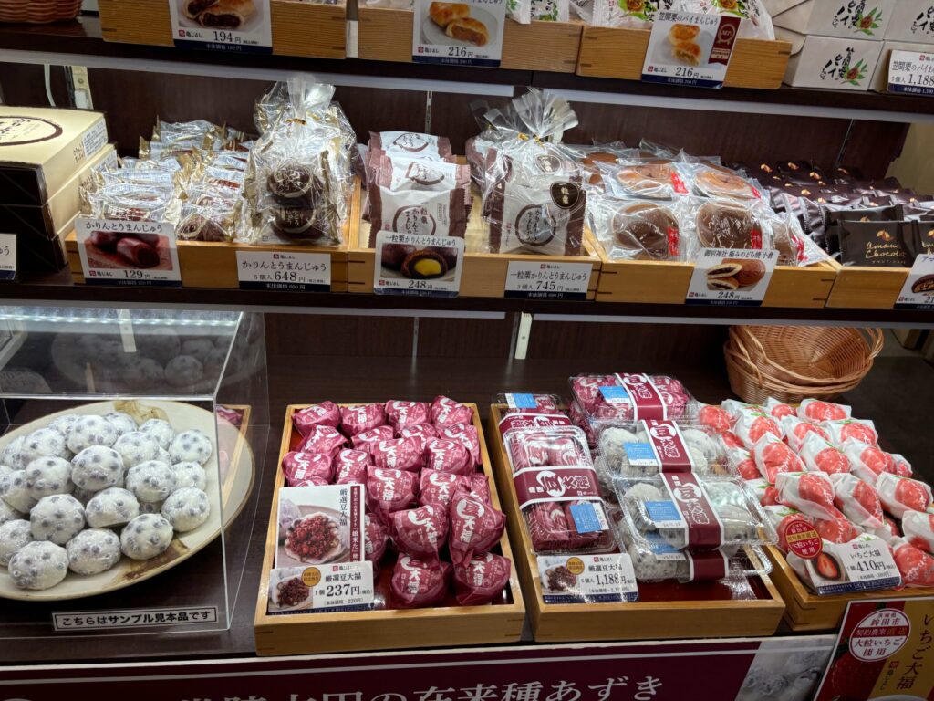 直売所の中にある「亀印本舗」では常陸太田産の稀少品種「娘来た」を使用した、こだわりのつぶ餡「厳選豆大福」や、季節限定の和洋菓子などが取り揃えられています。