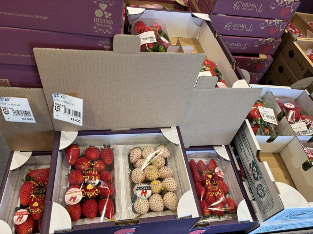 旬の果物コーナーには12月でありながらも苺の販売もしていました。いばらキッスや白苺の詰め合わせで贈答用、ご自宅用に購入するのも良いですね。