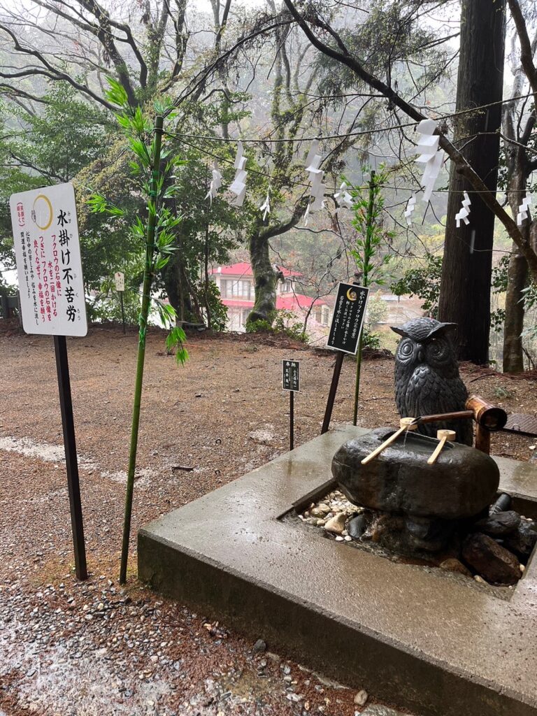 フクロウの石像に水を2回かけ、次にフクロウの石像を良くなでてることど家庭円満・身体健全・金運成就など多くの幸せが舞い込んで来るといわれています。